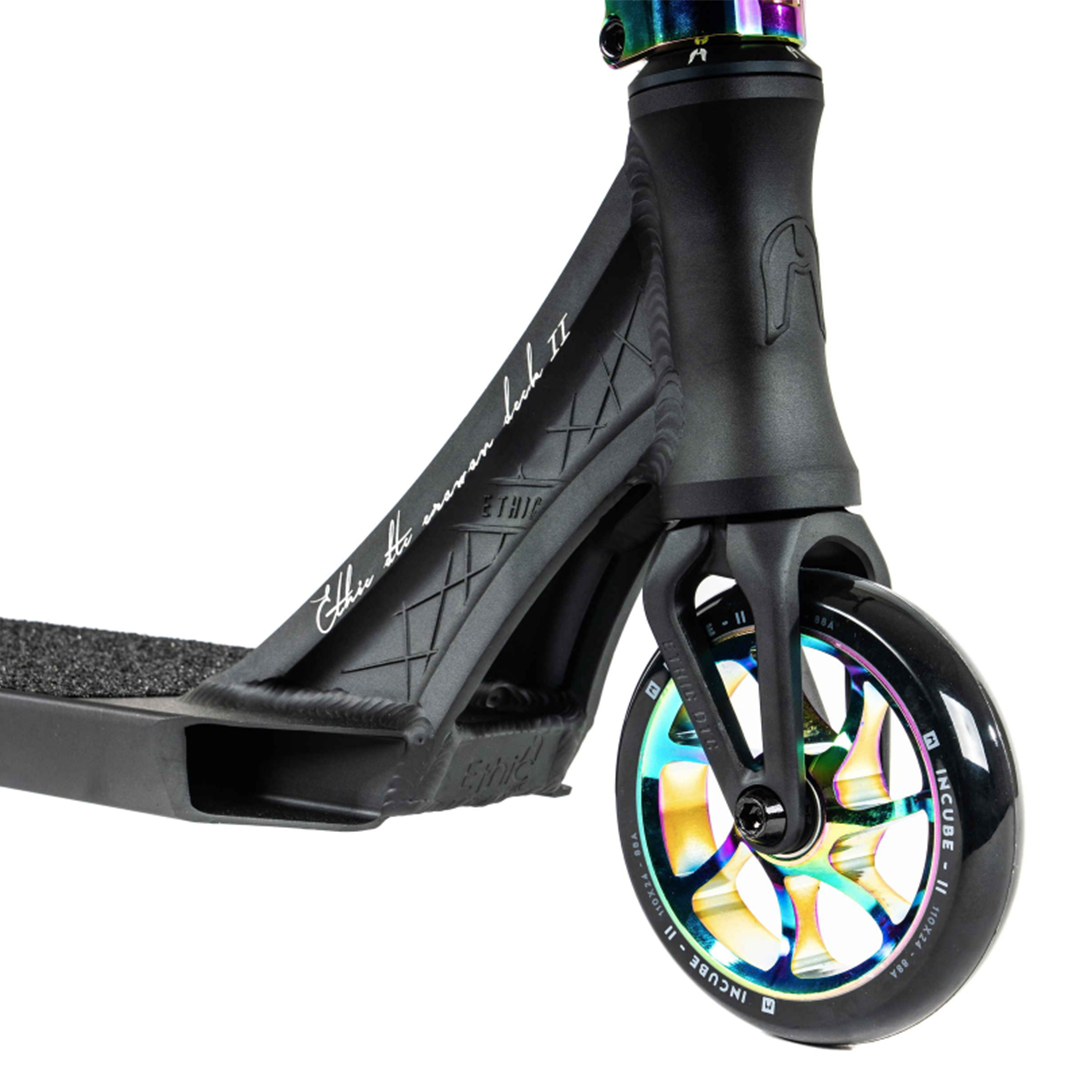 This scooter include all the latest parts from Ethic DTC: Erawan Deck v2 / Dryade Bar v2 / Legion v2 IHC Fork / Incube v2 110mm Wheels / Valkyria clamp / slim grips.