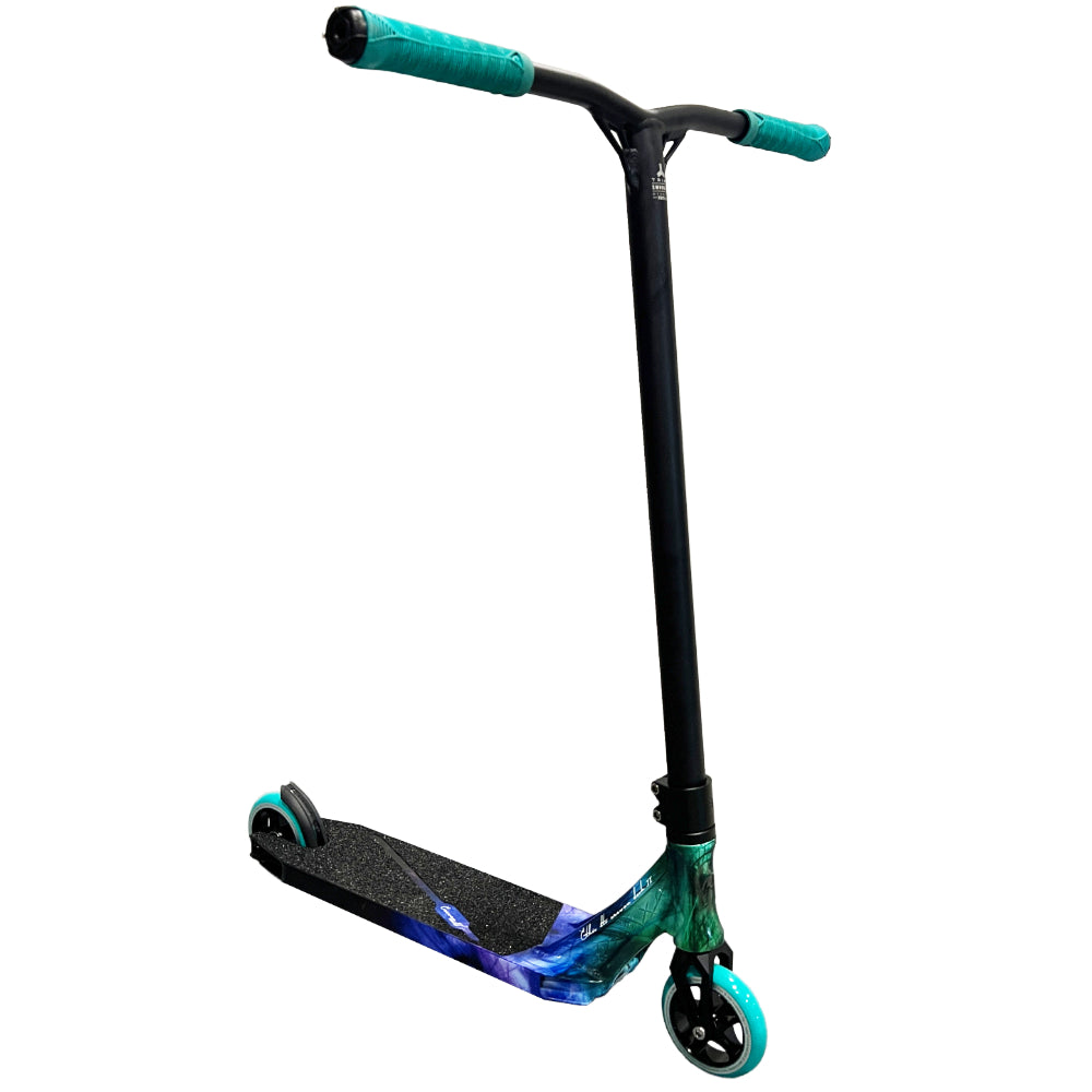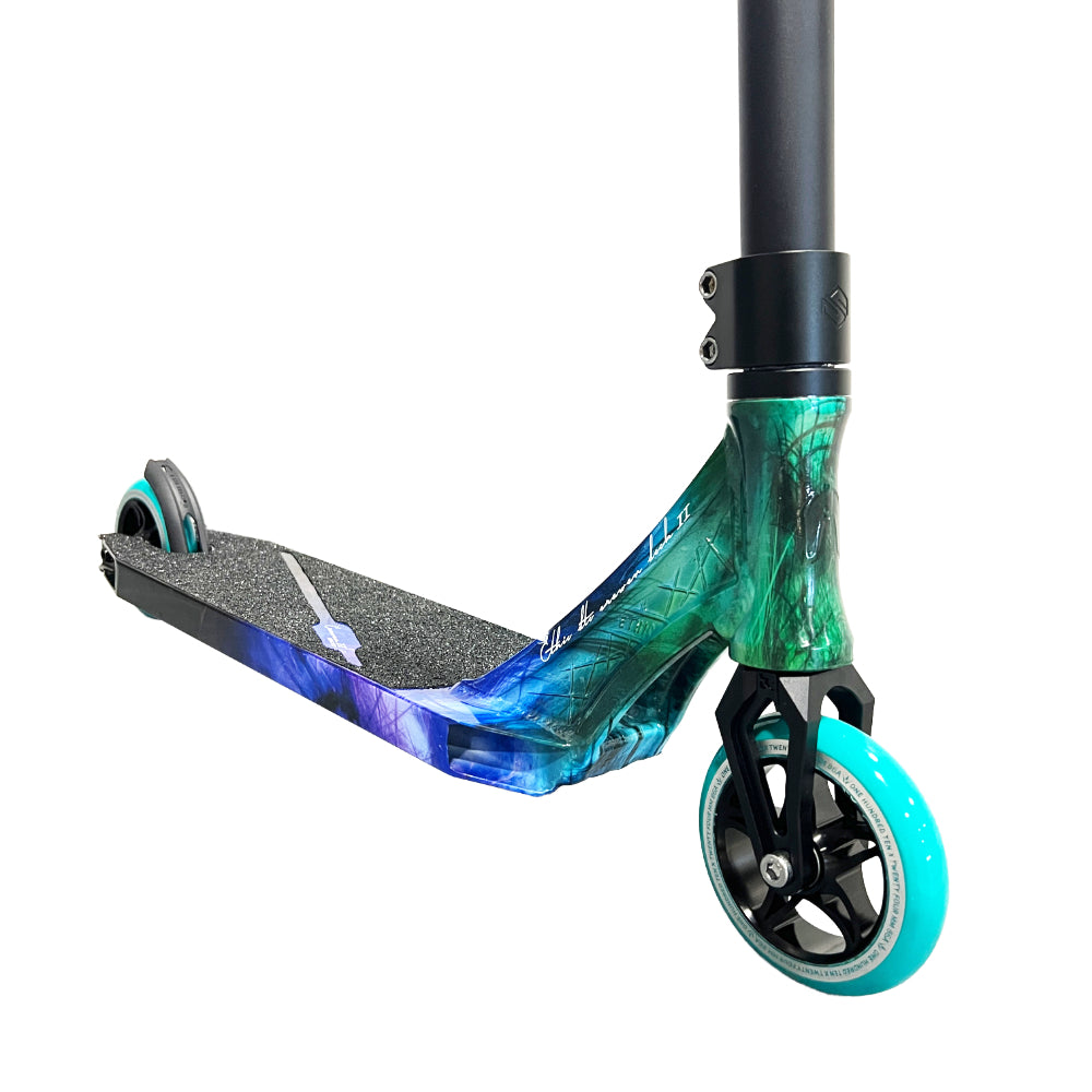 Ride in style with The Smugridium - Custom Scooter! Featuring a beautiful blue iridium, black, and teal color way, this scooter is perfect for park riders of any level. Its lightweight design allows for smooth and effortless tricks. Show off your skills and make a statement with this eye-catching ride.