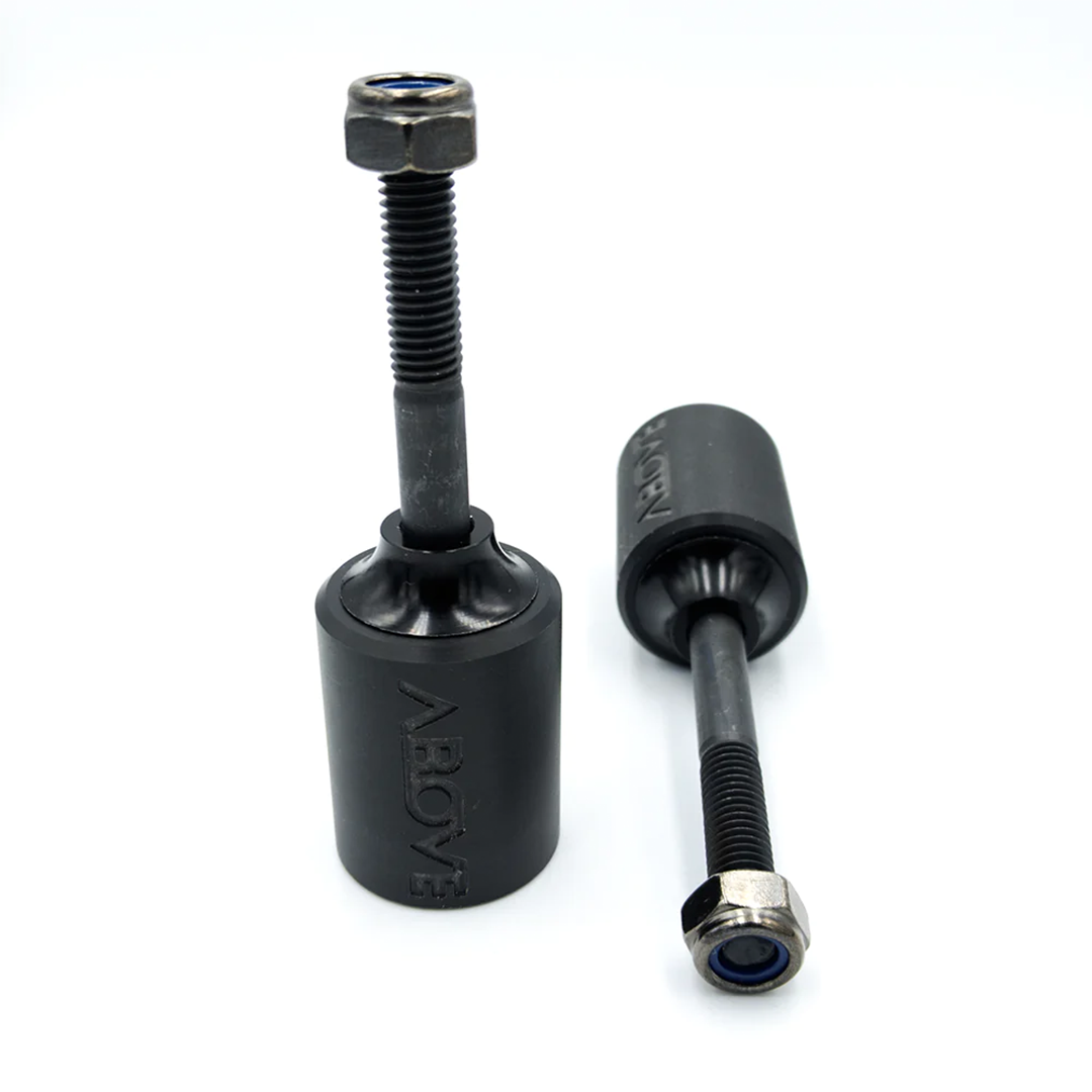 The Above V3 pegs modernizes our proven hybrid of plastic and metal by increasing the outer diameter to a massive 30mm and adding new steel hardware, which rigidly holds the nylon sleeve in place, allowing it to do all of the work. Nylon’s naturally low coefficient of friction and self-lubricating properties allow it to slide on surfaces that traditional aluminum or steel pegs would simply stick or catch on.