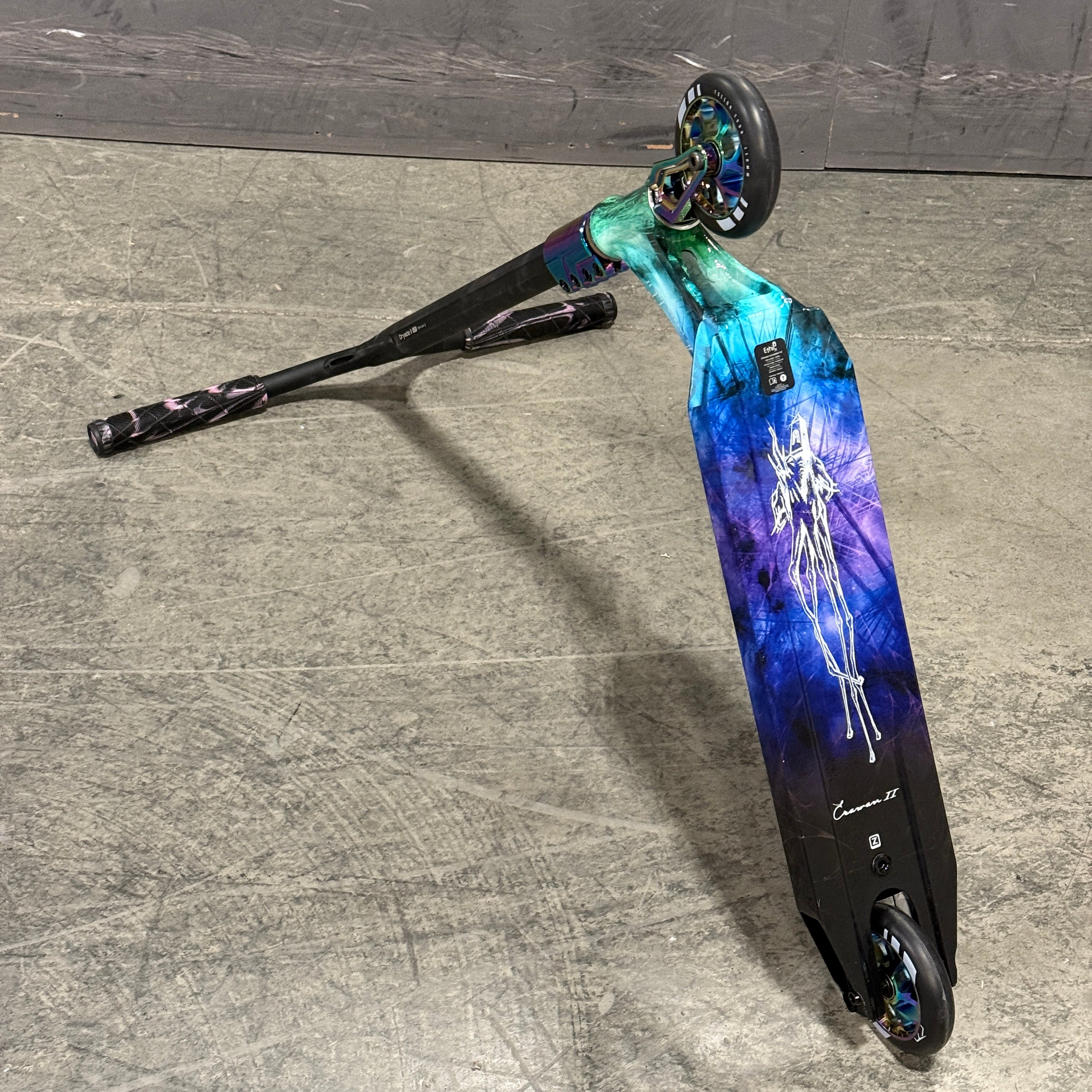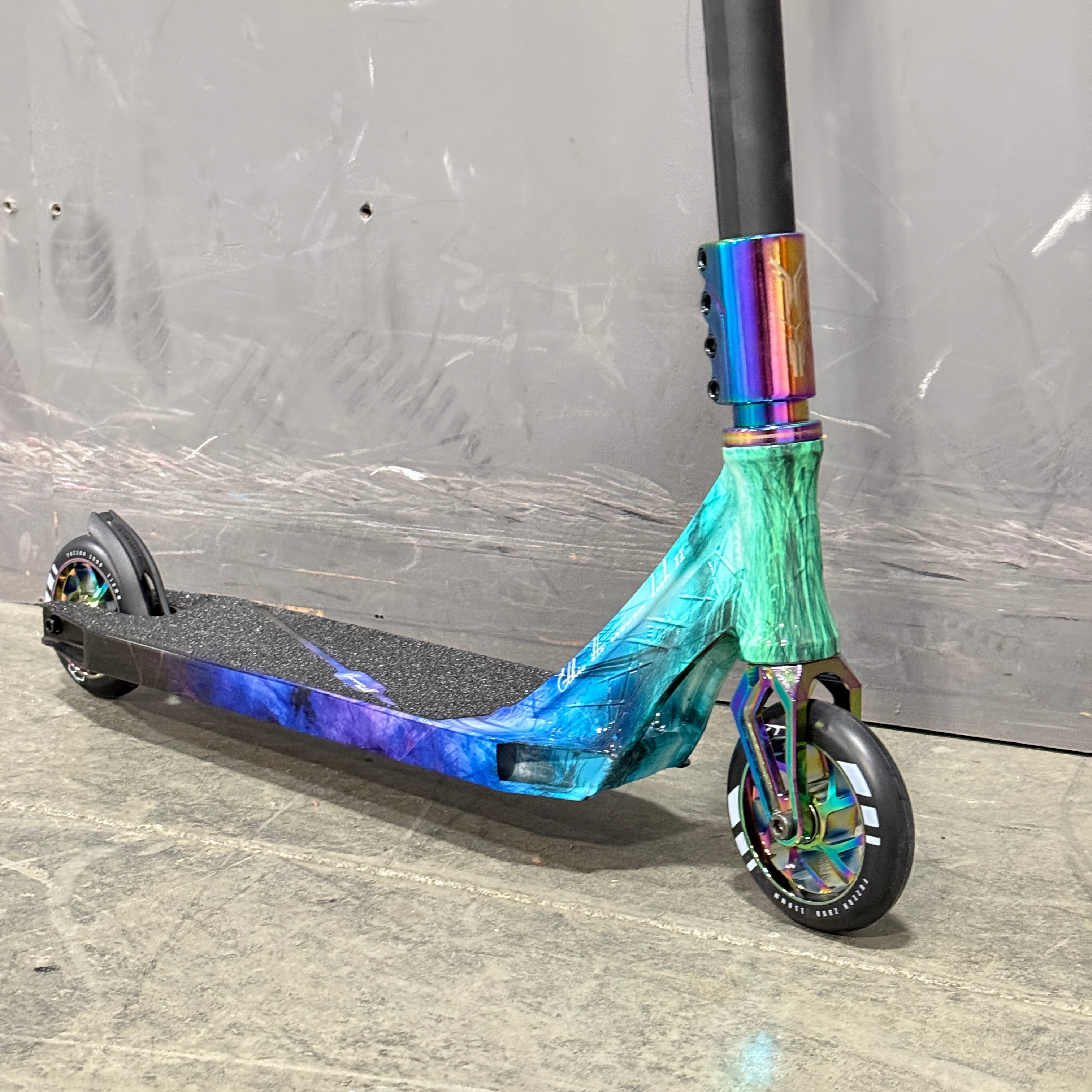 Enhance your park riding with the Ethic Oilridium custom scooter. Its light yet strong deck, sleek oil slick and black color combo, and SCS compression system will take your skills to new heights. Perfect for park riders, this scooter is sure to impress!