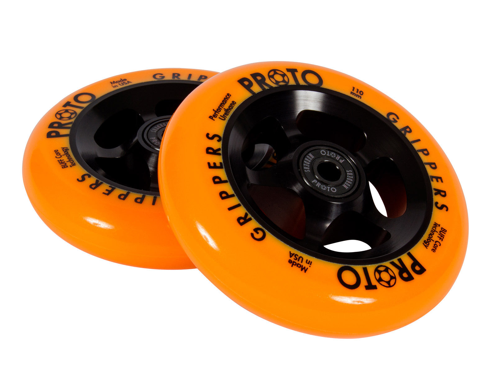 110 MM Wheel-Grippers are very fast and grip the surface Bearing Removal Slots-Machined into the core Anodized 6061 T-6 Aluminum Core for Durability. 100% Made In California PROTO Murders Bearings Pre-Installed GITN-UPC-EAN Number: 081351102259-7 Gripper wheels are some of the fastest wheels on the market. PROTO Wheels are made in the USA and have an anodized core for durability. Featuring BUFF Core Technology to reduce dehubbing. All PROTO Scooter Wheels come with bearing removal slots for taking bearings out with ease. These wheels come with High Quality PROTO Murders Bearings Pre-installed. Limited 90-day warranty.