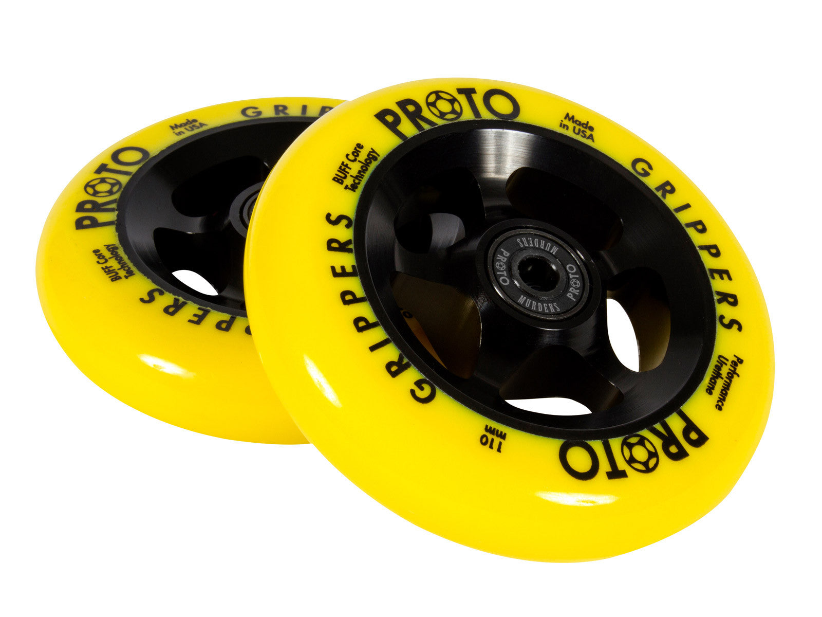 110 MM Wheel-Grippers are very fast and grip the surface Bearing Removal Slots-Machined into the core Anodized 6061 T-6 Aluminum Core for Durability. 100% Made In California PROTO Murders Bearings Pre-Installed GITN-UPC-EAN Number: 081351102259-7 Gripper wheels are some of the fastest wheels on the market. PROTO Wheels are made in the USA and have an anodized core for durability. Featuring BUFF Core Technology to reduce dehubbing. All PROTO Scooter Wheels come with bearing removal slots for taking bearings out with ease. These wheels come with High Quality PROTO Murders Bearings Pre-installed. Limited 90-day warranty.
