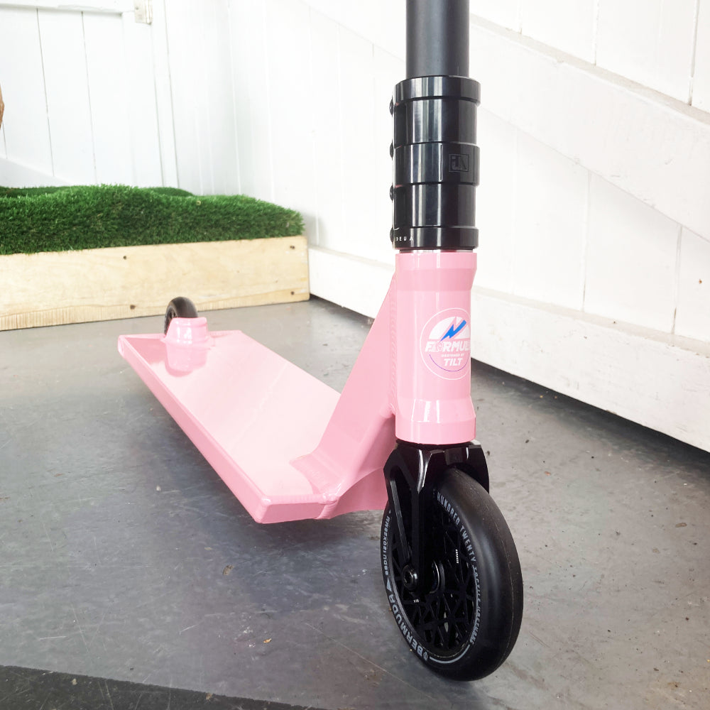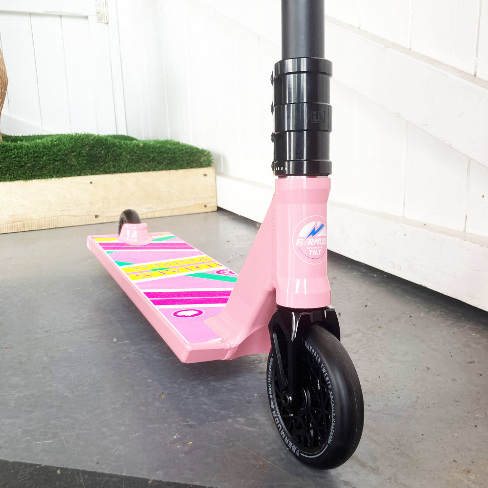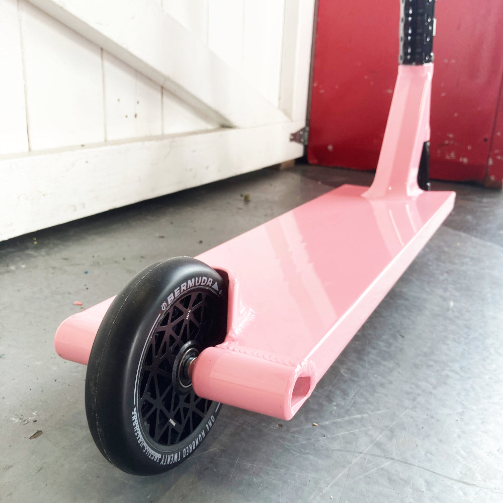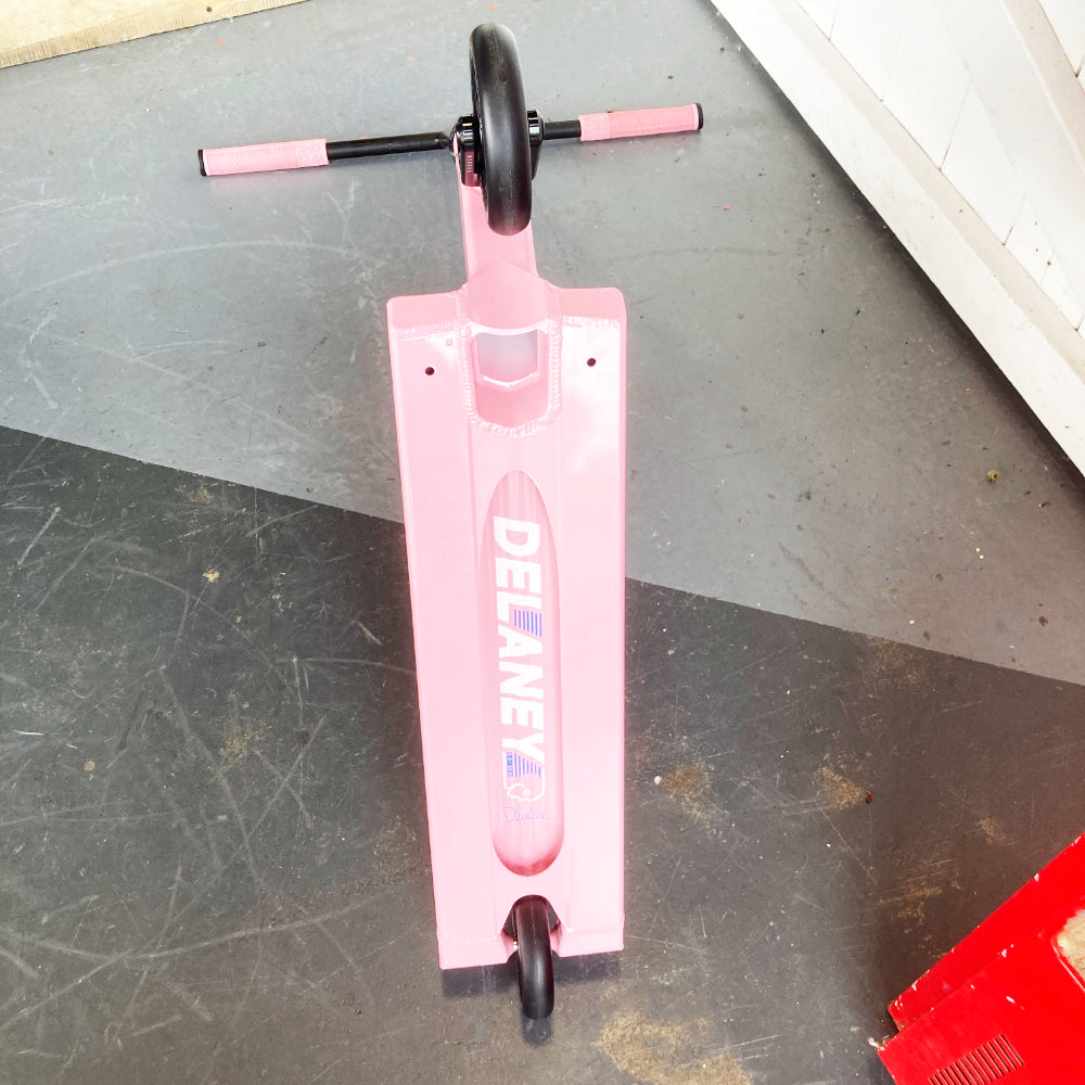 La custom scooter ''Léo est dans le rose'' a été la toute premiere custom construit par notre stagiaire. Livré avec le magnifique deck signature Delaney Ball, cette custom est littéralement parfait pour tout rider à la recherche d'un scoot léger et réactif ainsi que d'un scoot street.