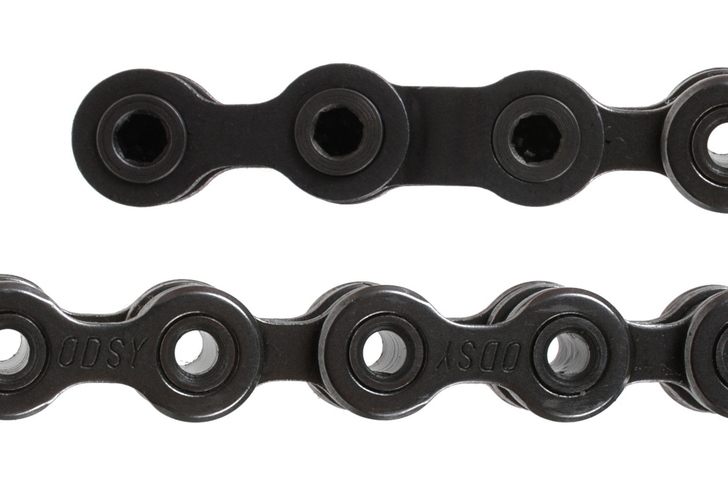 1. OVERSIZE PINS: Traditional chain pins are 3mm in diameter. The Key Chainäó»s are 5mm, and they are available with a hollow or solid pin assembly. These oversized pins are 4-times stronger than traditional pins, and the chances of bending one, whether the pin is hollow or solid, are essentially zero. The 5mm riveted pins provide added strength, but they also provide a bigger contact surface with the chainäó»s plates, which makes them harder to push out or bend. The hollow pin assembly, by design, allows for a stronger rivet connection to form during manufacturing, resulting in a stronger chain overall.