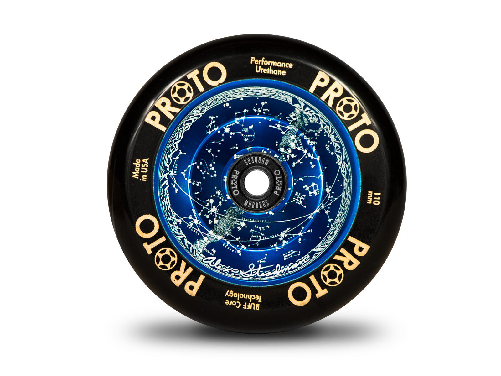 110mm Grippers are very fast and grip the surface Bearing Removal Slots-Machined into the core Anodized 6061 T-6 Aluminum Core for Durability 100% Made In California PROTO Murders Bearings Pre-Installed GITN-UPC-EAN Number: 081351102000-5 Alex Steadman's second signature wheel. This time around it’s a Full Core Gripper with a laser engraved Cosmos graphic on a Blue Core with Black Urethane. The graphic was handpicked and matches his shirt. Gripper wheels are some of the fastest wheels on the market. PROTO Wheels are made in the USA and have an anodized core for durability. Featuring BUFF Core Technology to reduce dehubbing. All PROTO Scooter Wheels come with bearing removal slots for taking bearings out with ease. These wheels come with High Quality PROTO Murders Bearings Pre-installed. 90-Day Limited Warranty. Anodized 6061 T-6 Aluminum Core for Durability. 100% Made In the California.