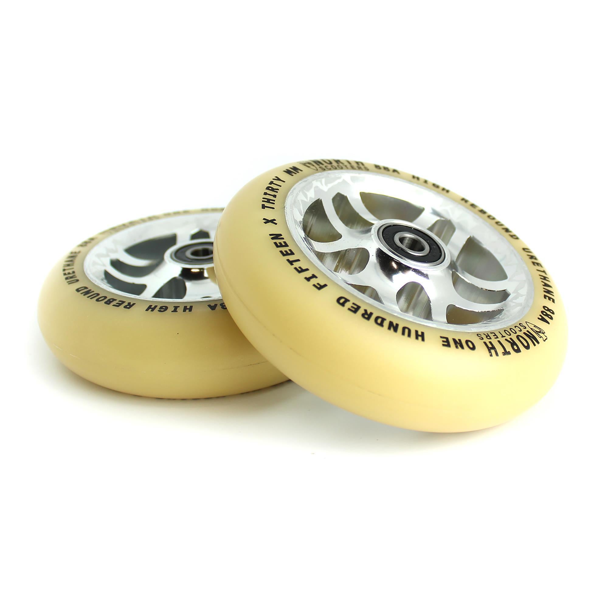 The North Contact Wheel is our 30mm wide Radix style wheel. It features a full CNC machined Aluminum core with a unique spoked design. These stylish cores paired with an 88a high rebound urethanemake for a scooter wheel that is both lightweight and durable. The 30mm wide size helps with balance and creates a wheel that is both faster and longer lasting. This wheel does come with our all new Abec 9 North Bearings pre-installed.