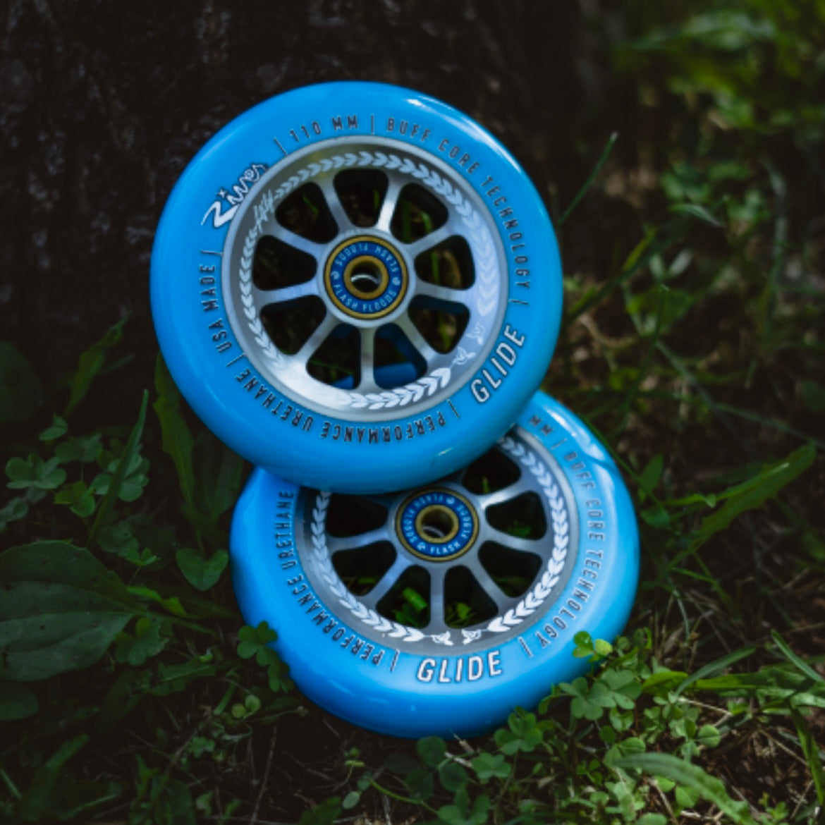 River Glides are smooth, fast and flowy. Hands down the smoothest wheel in the scooter industry and ideal for hitting the park. Featuring BUFF Core Technology to reduce dehubbing. All River Wheels come with bearing removal slots for taking bearings out with ease. These wheels come with High Quality River Flash Flood Bearings Pre-installed. RIVER - STICKERS INCLUDED! All River Wheels come with a 90-day Warranty against chunking. Anodized 6061 T-6 Aluminum Core for Durability. 100% Made In the California.