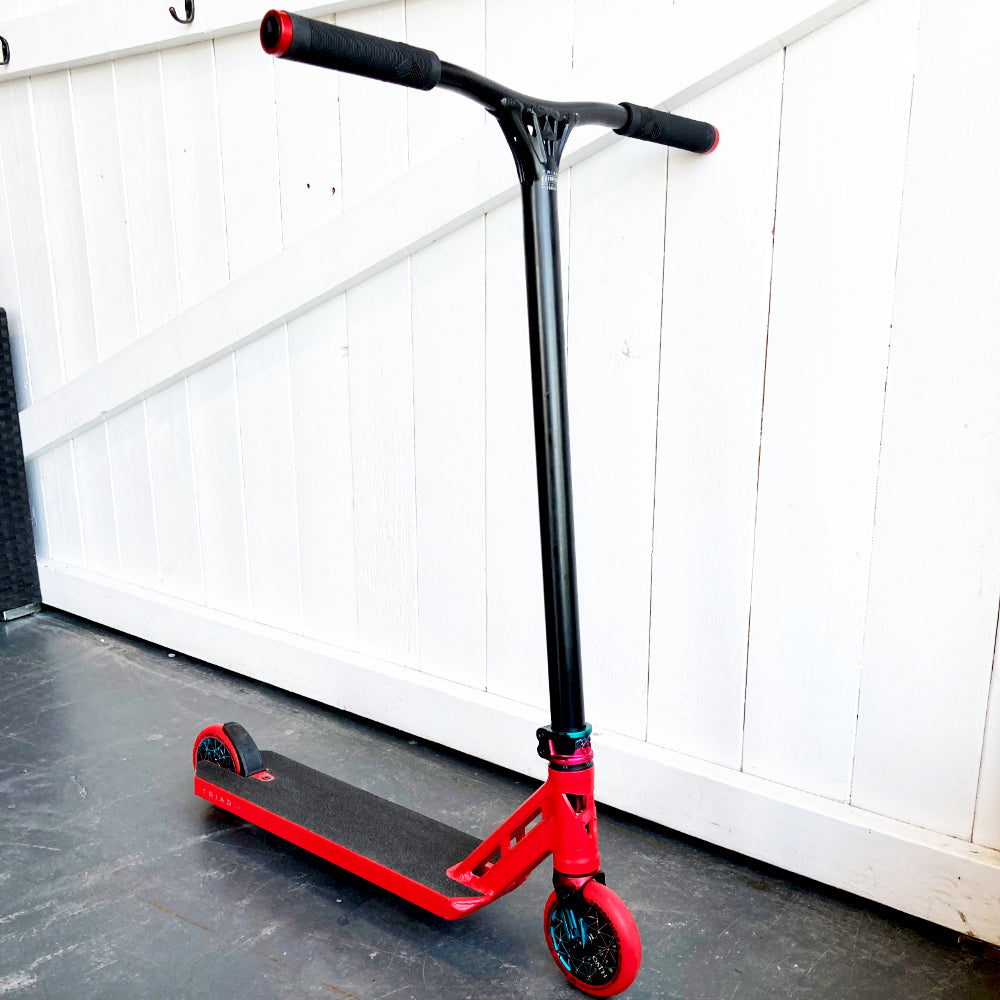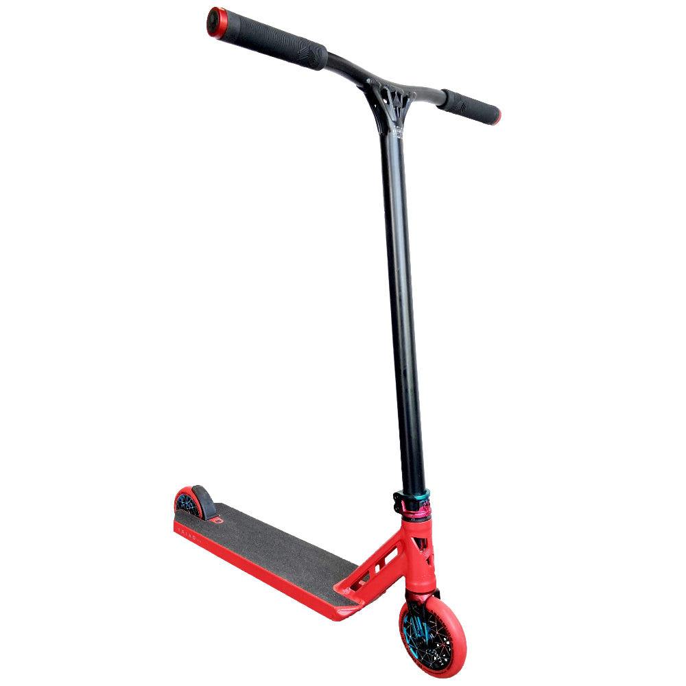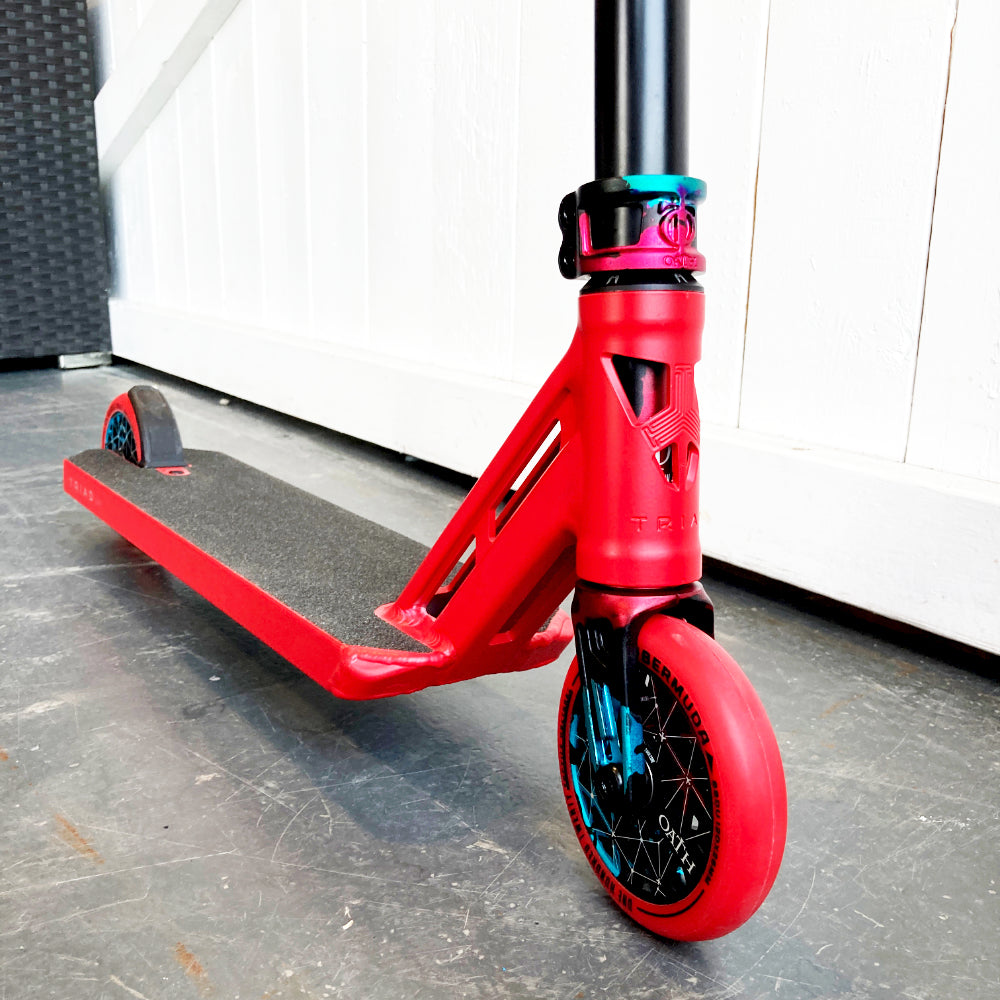 La RED Park Custom a été conçue pour être une trottinette professionnelle pour grands! Rouge sur rouge, elle donne l'impression d'aller à toute vitesse pour prendre ces rampes et avec les roues Bermuda de 120x26 mm, elle vous permettra de vous envoler à coup sûr. Le nouveau deck Triad Psychic V2 maintient le poids bas sous vos pieds et le guidon Extortion avec gousset forgé et alu 7k dans vos mains vous offrent un équilibre parfait.
