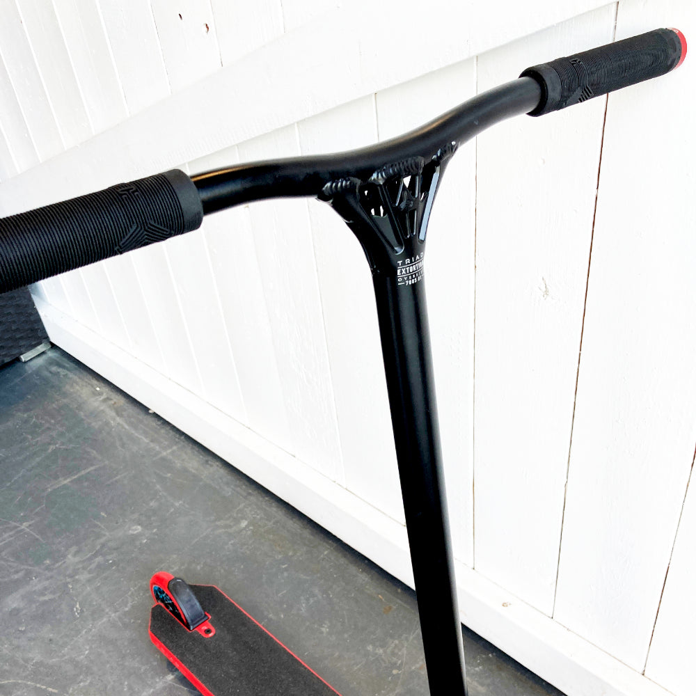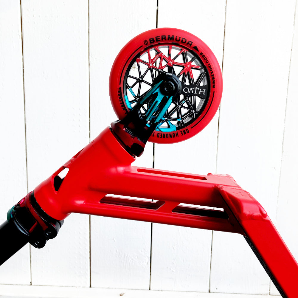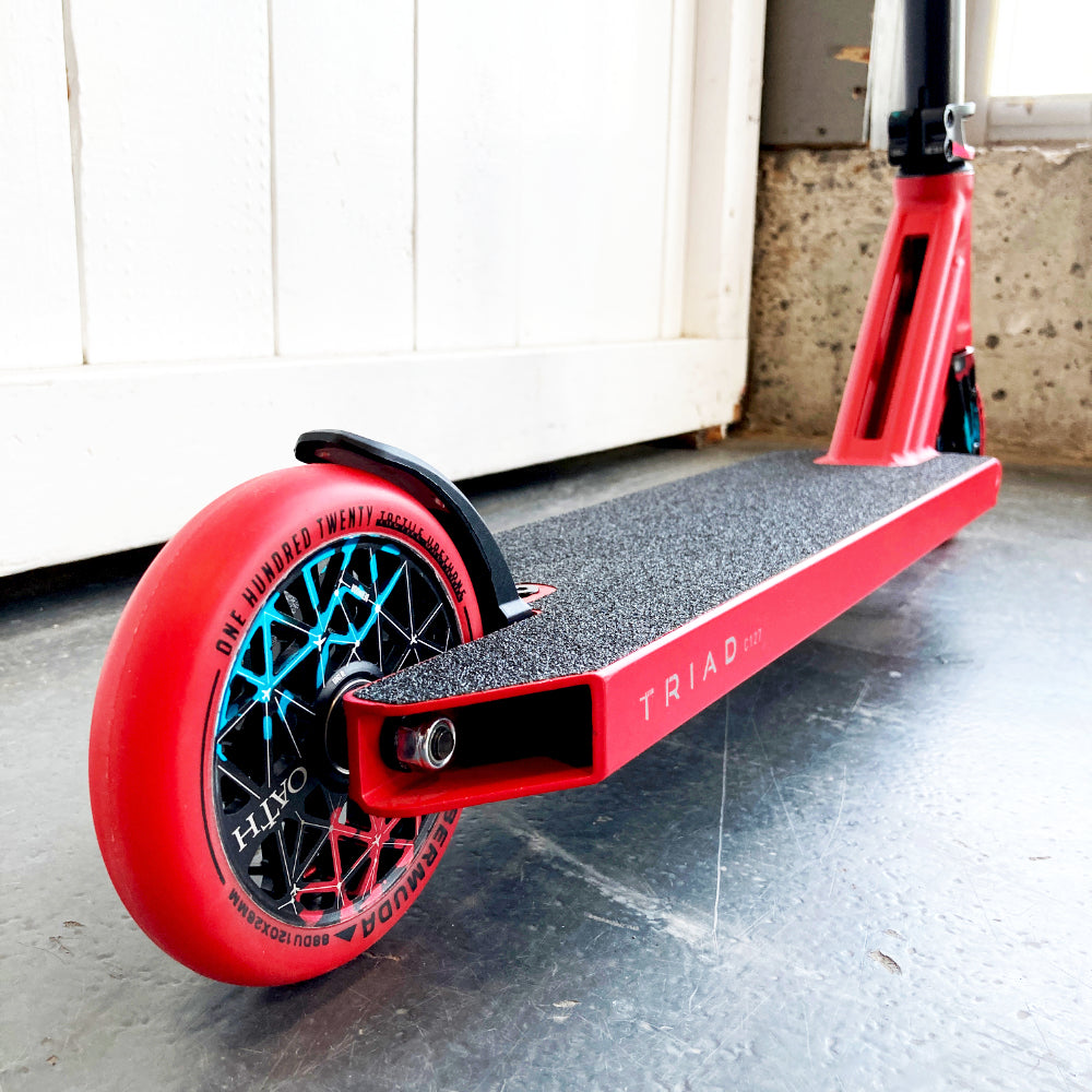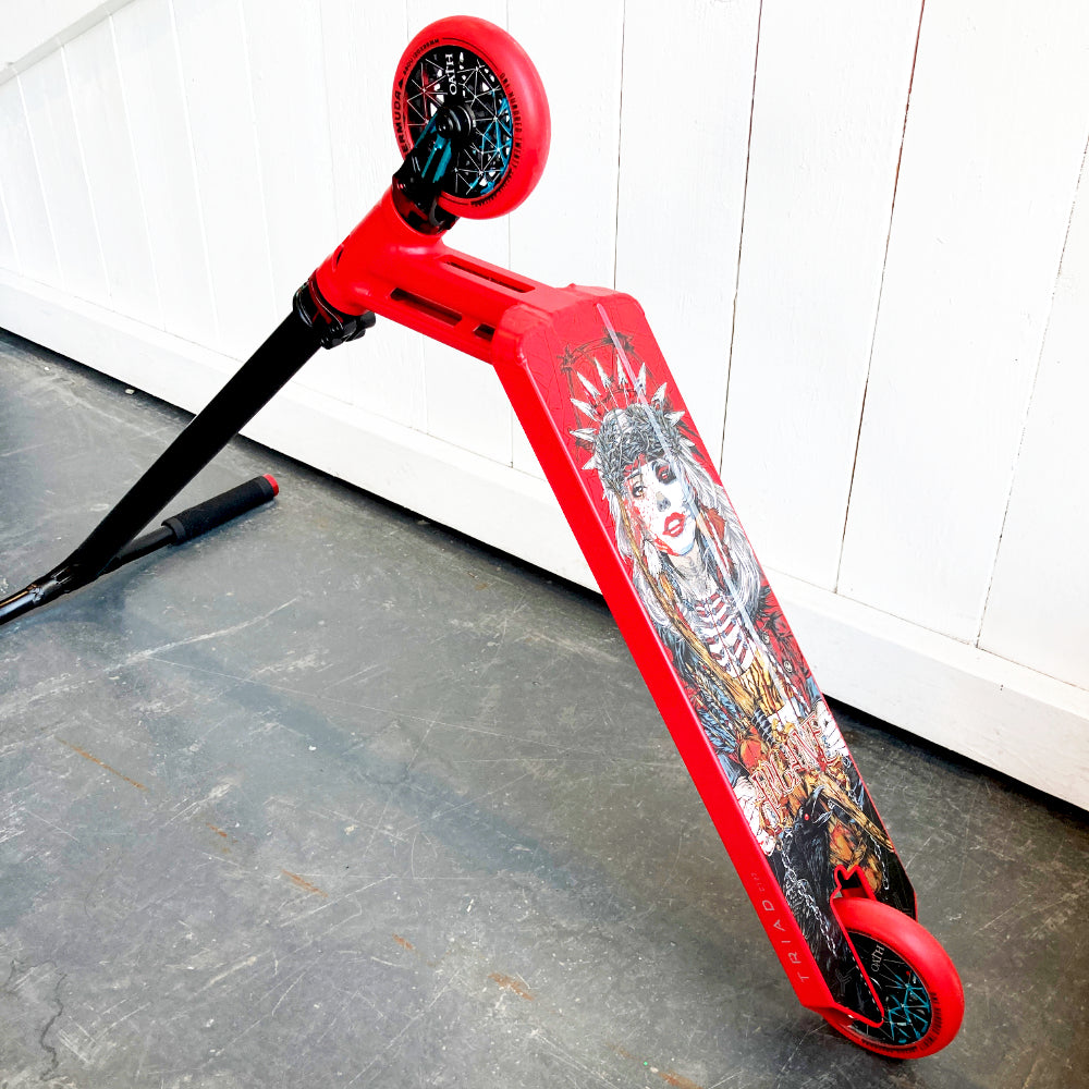 La RED Park Custom a été conçue pour être une trottinette professionnelle pour grands! Rouge sur rouge, elle donne l'impression d'aller à toute vitesse pour prendre ces rampes et avec les roues Bermuda de 120x26 mm, elle vous permettra de vous envoler à coup sûr. Le nouveau deck Triad Psychic V2 maintient le poids bas sous vos pieds et le guidon Extortion avec gousset forgé et alu 7k dans vos mains vous offrent un équilibre parfait.