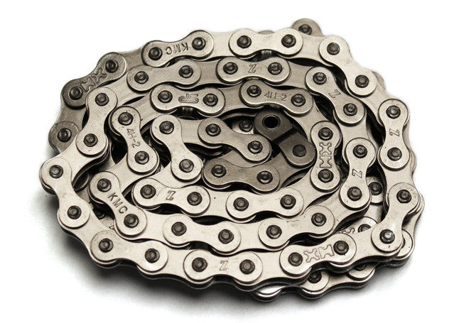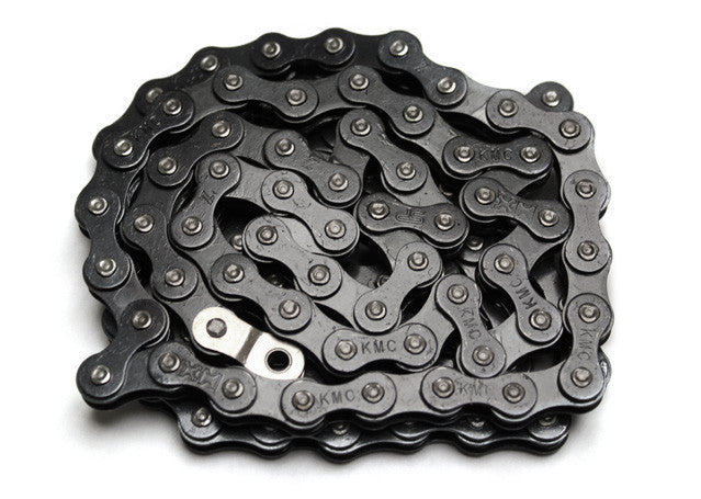 The KMC 510HX chain has a proven track record of being a reliable and affordable 1/8 single speed chain. The chain has mushroom rivets linked with heavy duty plates and is given the stretch proof treatment. This chain also comes with an installed half link to give you that perfect chain length needed. Now you also get more great colours to choose from.