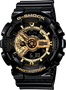 G-Shock adds high gloss finishes and gold dials to its X-Large case designs for a visually powerful look. Black resin band analog and digital watch with gold face.