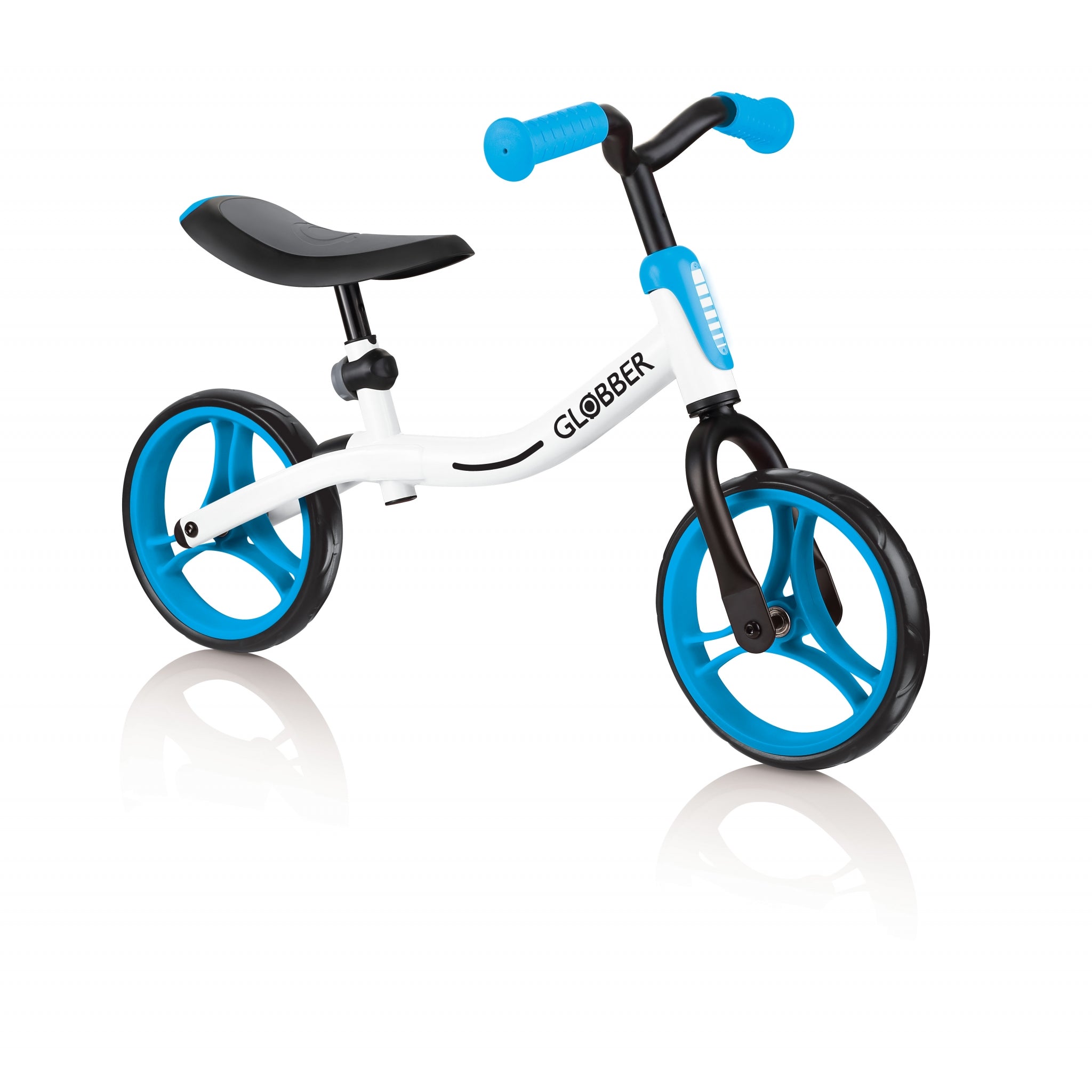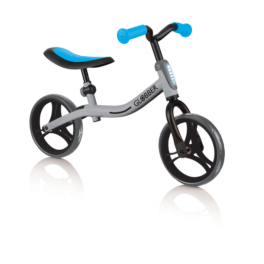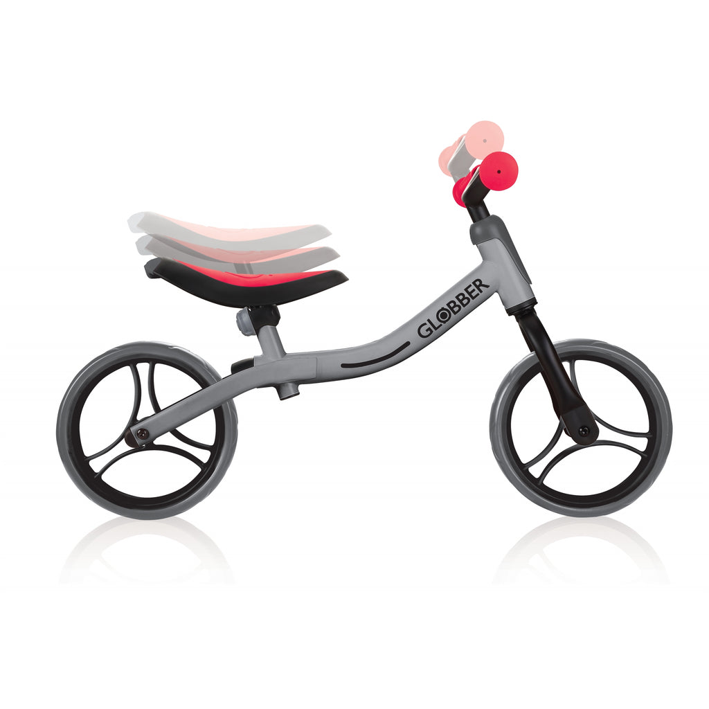 - GO BIKE balance bike for toddlers is an adjustable balance bike, coming with an 8-height adjustable saddle (4-heights per frame position), made of soft, comfortable PU, and 2-height adjustable, curved metal balance bike handlebars with durable TPR ergonomic grips for extra comfort.