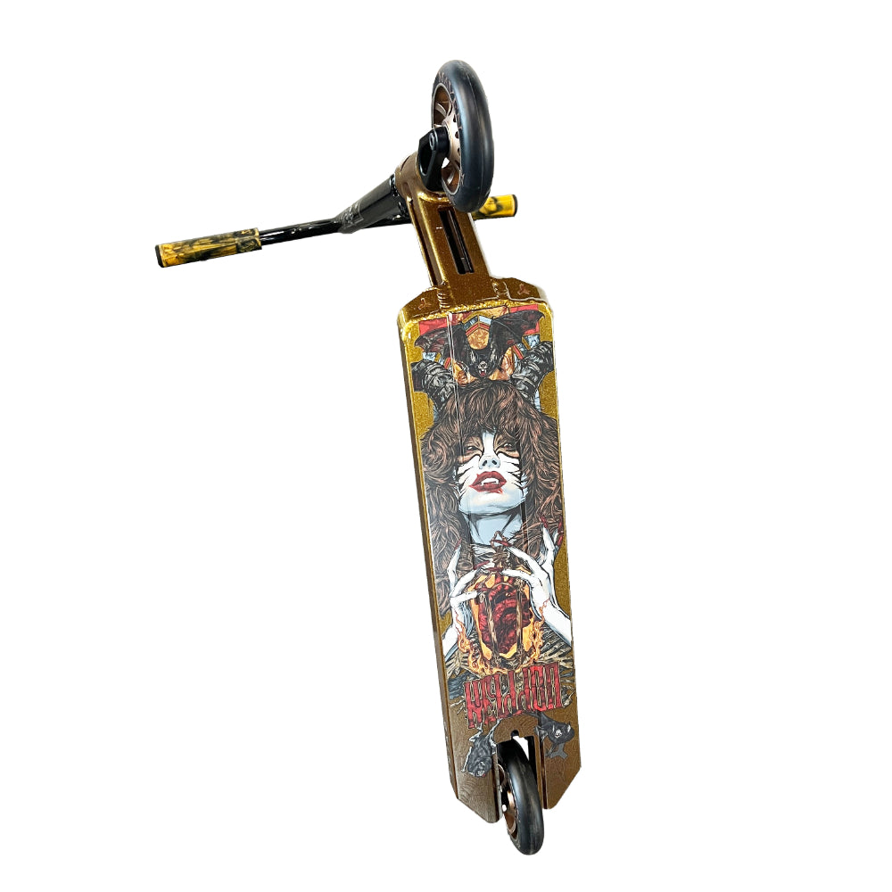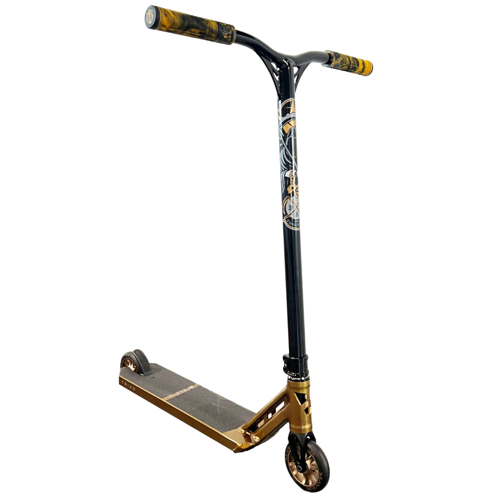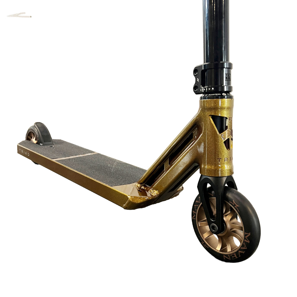 Ride in style and conquer the park with The Triad Bronze Park - Custom Scooter! Featuring a sleek and durable bronze and black colorway, this scooter is perfect for any park rider. Its lightweight design provides the ultimate performance without sacrificing strength. Take your skills to the next level and stand out from the crowd with this custom scooter!