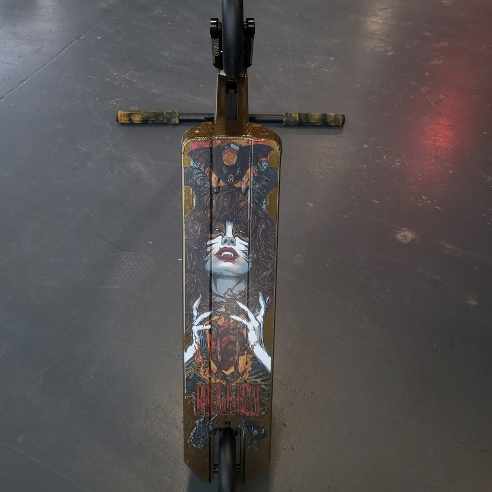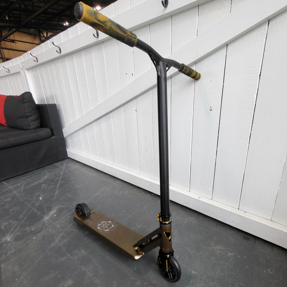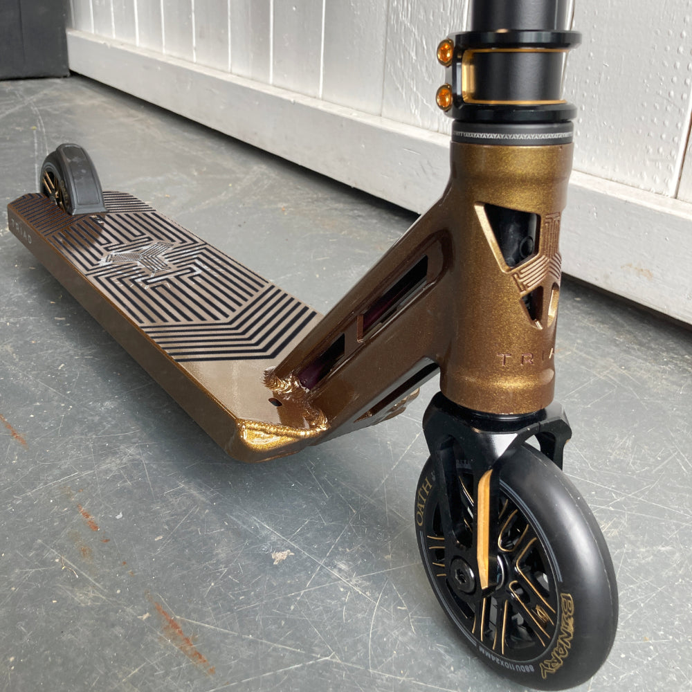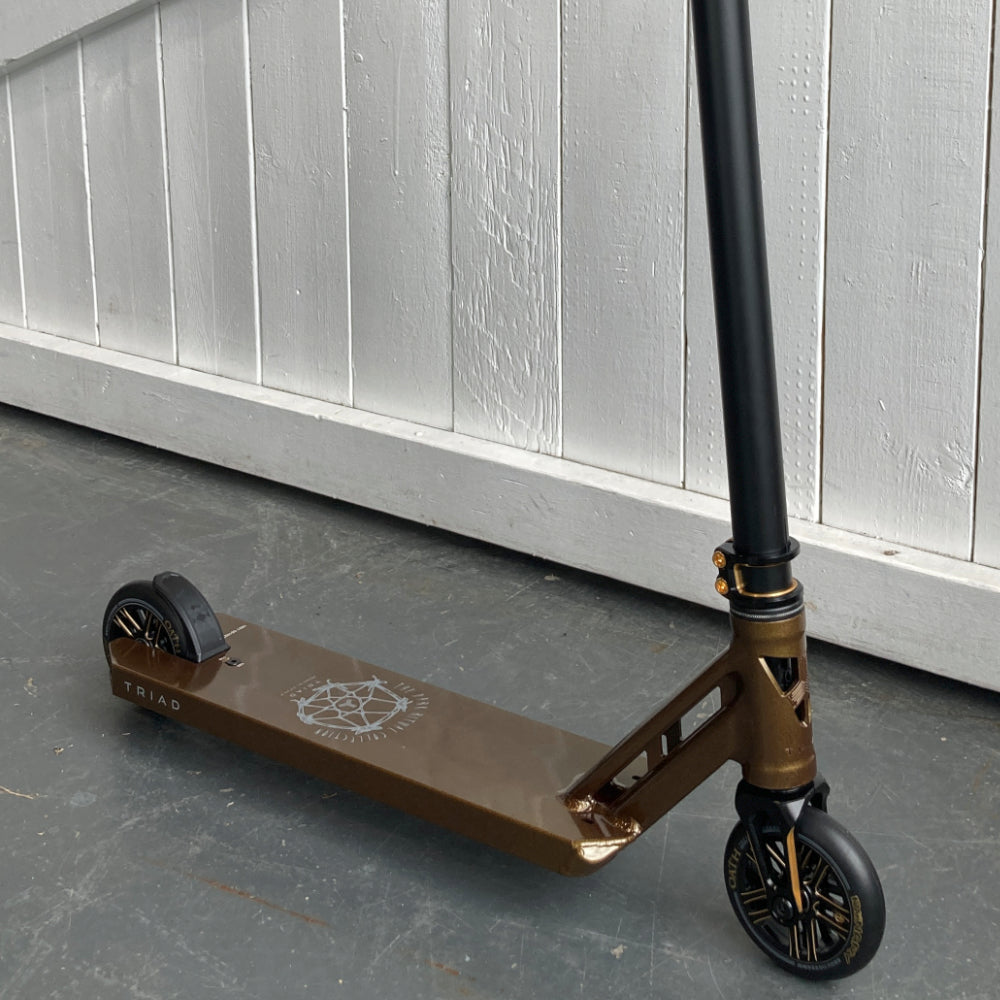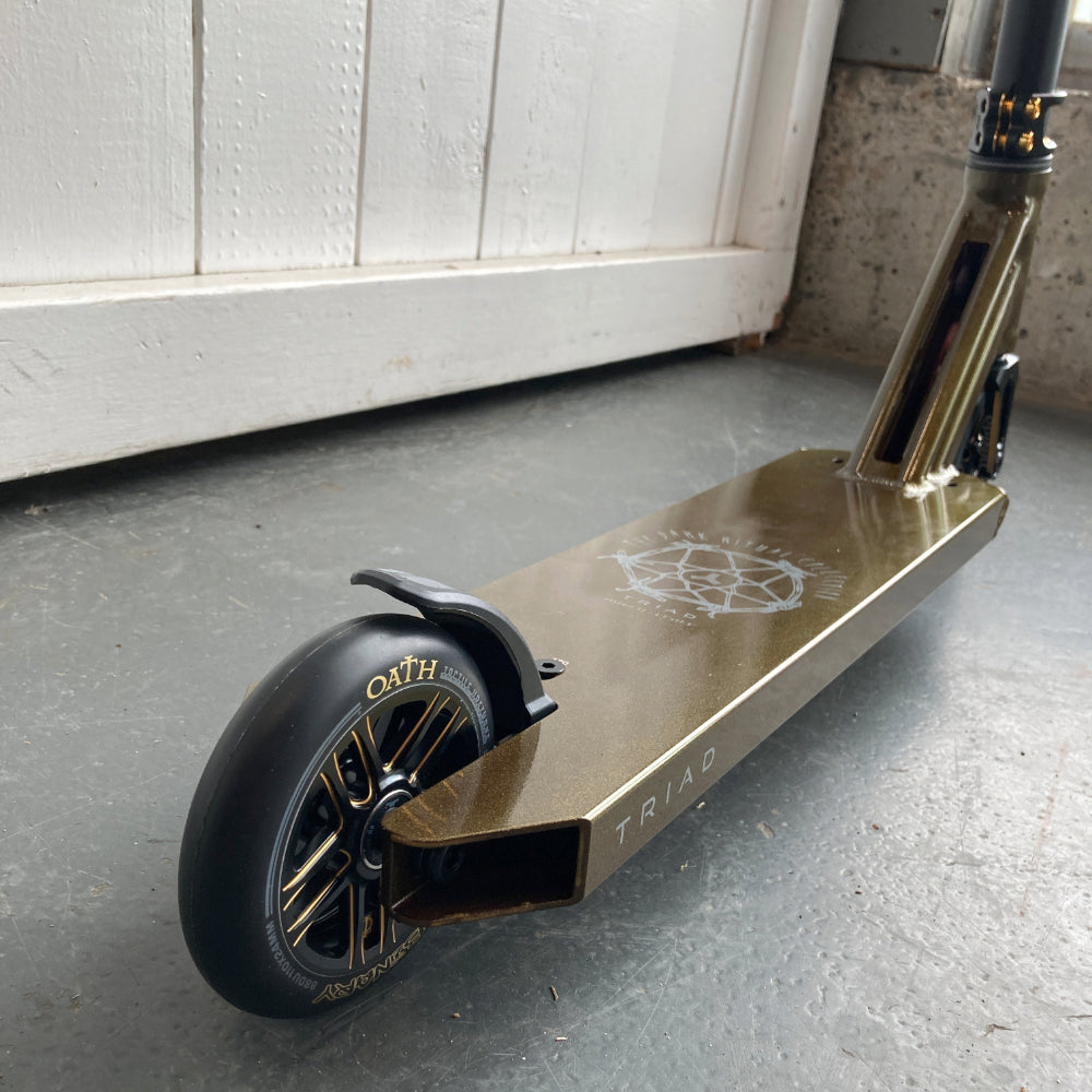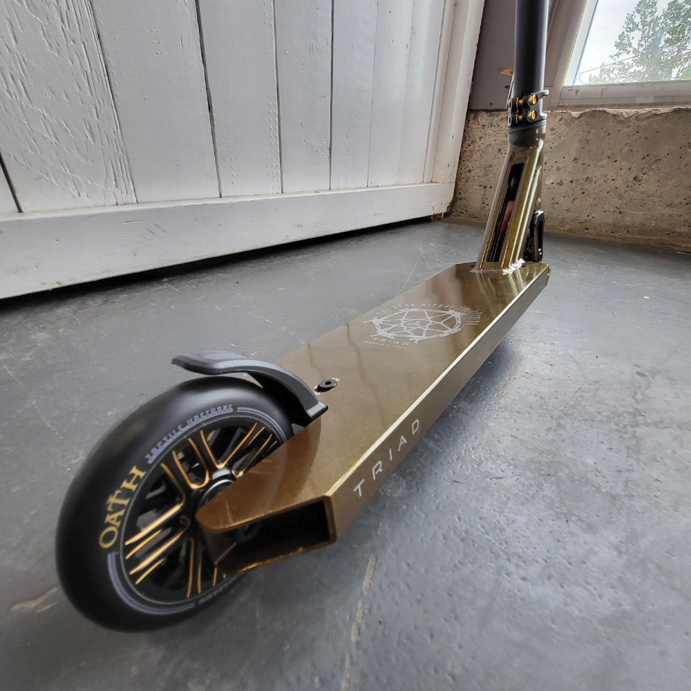 The TROATH is built from some of the finest parts Oath and Triad have to offer. You guessed it, thats where the name is from. The oath Spinal fork, carcass clamp and binary wheels combine for a beautiful aesthetic while maitaining a super lightweight scooter. The Psychic V2 deck from Triad brings it all together in a solid but lightweight frame.